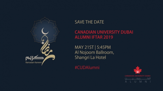 Canadian University Dubai Alumni Office invites its Alumni Community for the first CUD Alumni Iftar on May 21st, 2019 at the Ballroom, Shangri-La Hotel, Sheikh Zayed Road.