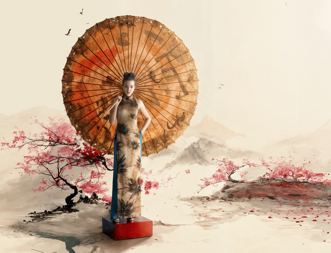 To complement the abaya, which symbolizes Emirati values of grace and continuity, the second garment draws inspiration from the Chinese qipao, a traditional dress associated with refinement, modesty, and cultural identity. The qipao, also known as the cheongsam, traces its origins to the long robes worn by Manchu women during the Qing dynasty. It began as a loose, flowing garment before evolving in 1920s Shanghai into the slim-fitting, high-collared silhouette known today, blending traditional Chinese motifs, such as embroidery and mandarin collars, with contemporary tailoring influences.