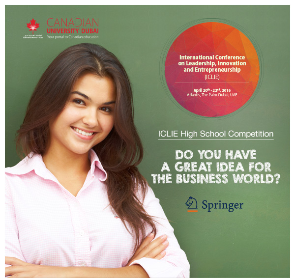 Alongside the International Conference on Leadership, Innovation and Entrepreneurship (ICLIE), http://www.iclie.com/ Canadian University Dubai invites young people to offer their own interpretation of the conference themes through the ICLIE High School Competition.