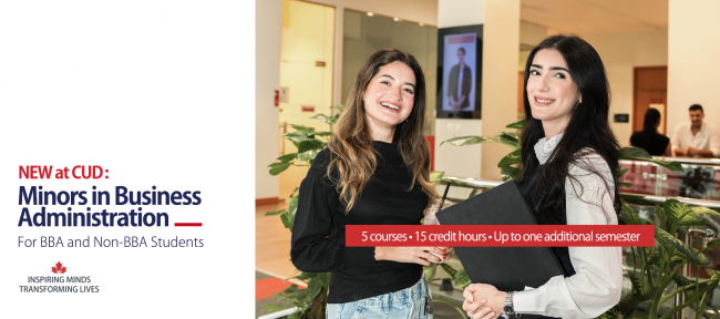 Reinforcing the university’s Canadian-inspired curriculum, the Minors in Business Administration will offer students the opportunity to explore additional areas of interest while aligning academic knowledge with real-world demands. BBA students in the School of Management can pursue a minor in one of the eight majors currently offered within the School, in addition to their primary specialization.  By combining two core business disciplines, students will graduate with an academic transcript reflecting both their major and minor fields of study.