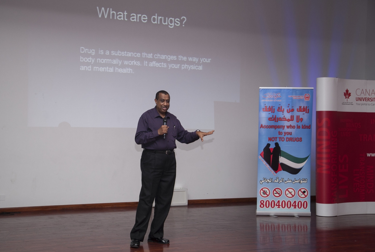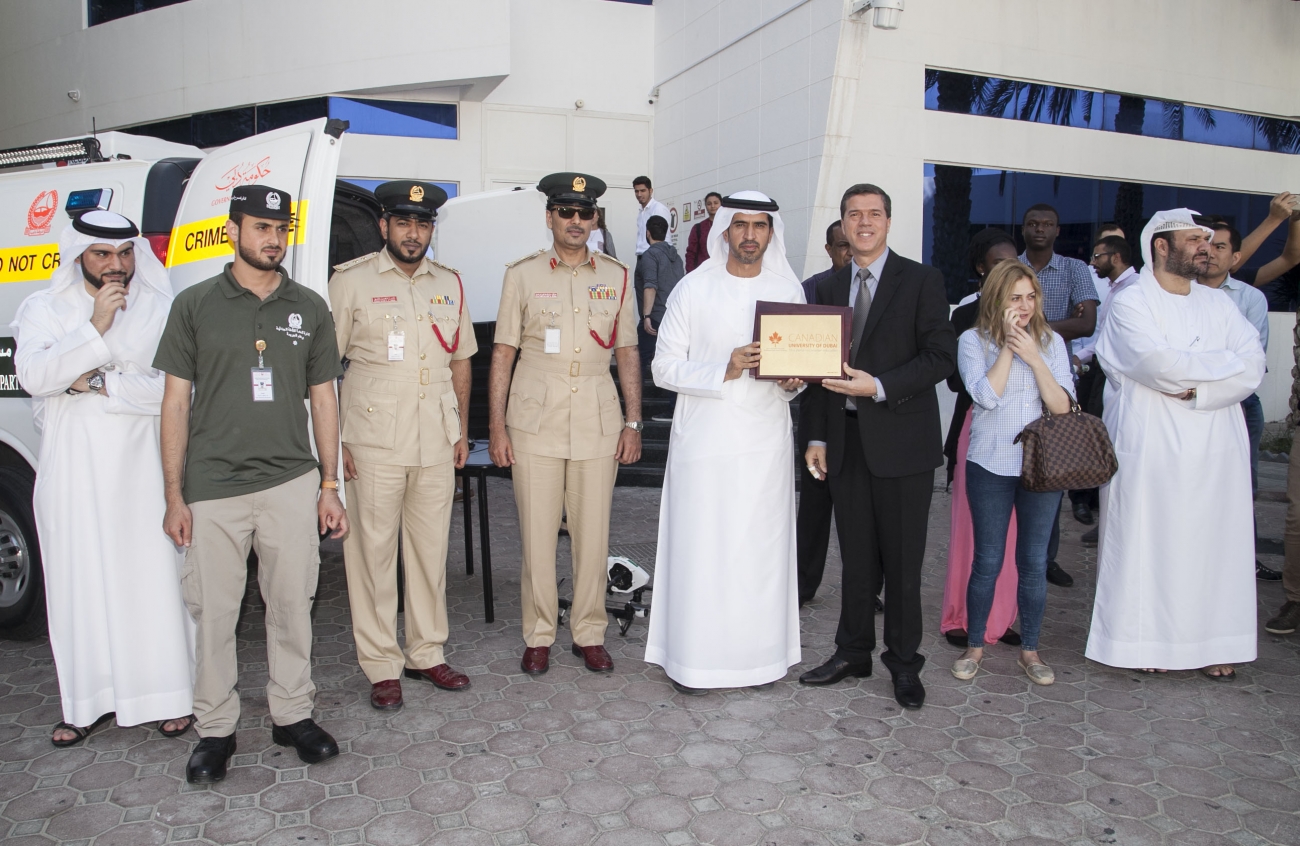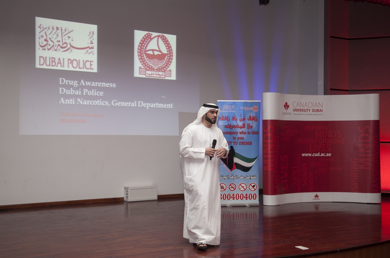 November 30th, 2015: Students from Canadian University Dubai (CUD) have been hearing from the Dubai Police ‘Dubai Watch’ team about the UAE’s criminal, traffic and anti-drug laws during an interactive awareness-raising session held recently on campus.